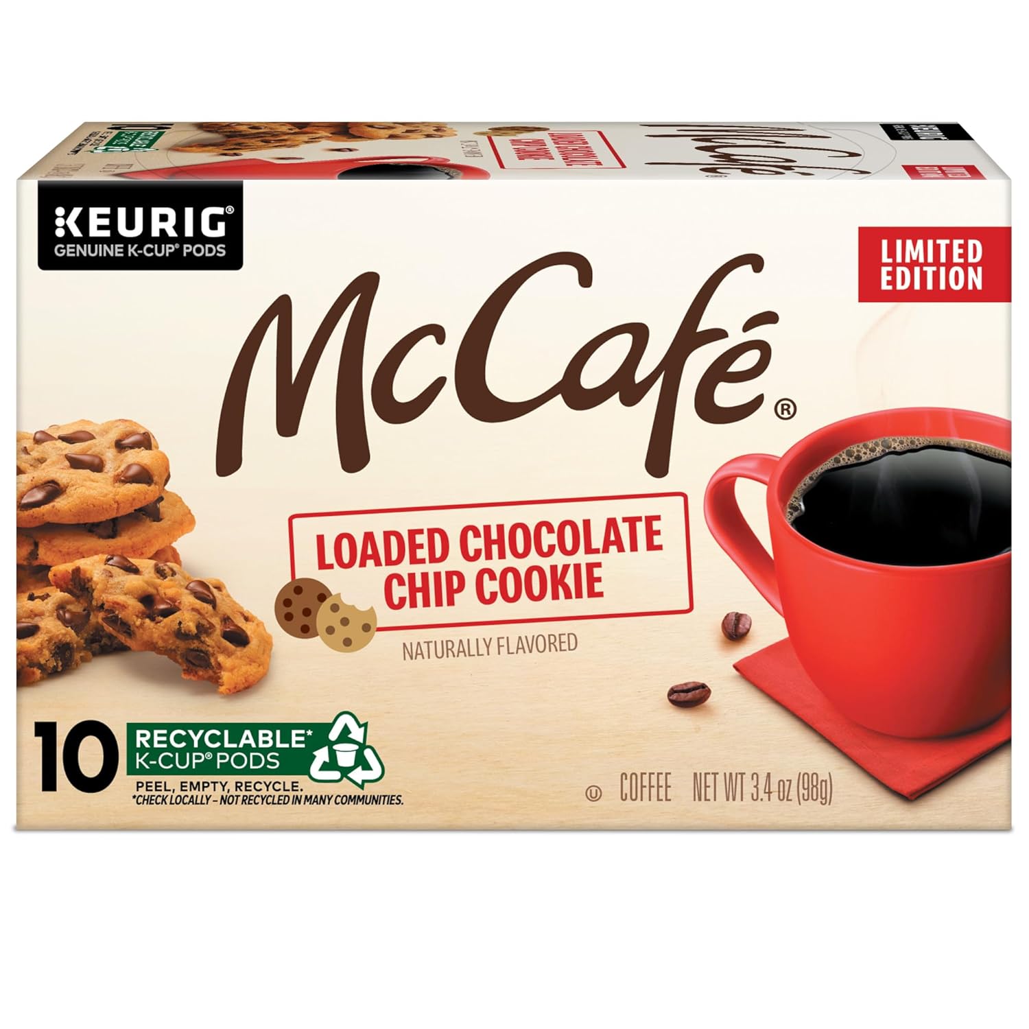 When the flavor and aroma of freshly baked, delightfully sweet chocolate chip cookies meet the smooth, satisfying taste of McCafe coffee, it's a batch made in heaven. Available for a limited time only, McCafe Loaded Chocolate Chip Cookie flavored coffee is perfect for filling every chilly winter day with warm and wonderfully fresh-from-the-oven flavor. At McCafe, we always start with premium Arabica beans and expertly roast them in a temperature-controlled environment to bring out the best taste, every time. Simply place a McCafe Loaded Chocolate Chip Cookie K-Cup pod into your Keurig coffee maker and enjoy rich, flavorful taste every time you brew. By using 100% Responsibly Sourced coffee in our K-Cup pods, we’re supporting a healthier planet and an improved quality of life for farming communities. So brighten your day with McCafe, a simply delicious coffee that keeps good going. And brew good by the cupful. Every McCafé Loaded Chocolate Chip Cookie K-Cup pod is compatible with any Keurig single serve coffee maker. Simple. Delicious. And recyclable.* Enjoy the same great-tasting coffee you know and love, and when you’re done, just peel, empty, and recycle. *Check locally, not recycled in many communities. McCafé at Home is a proud partner of Ronald McDonald House Charities.